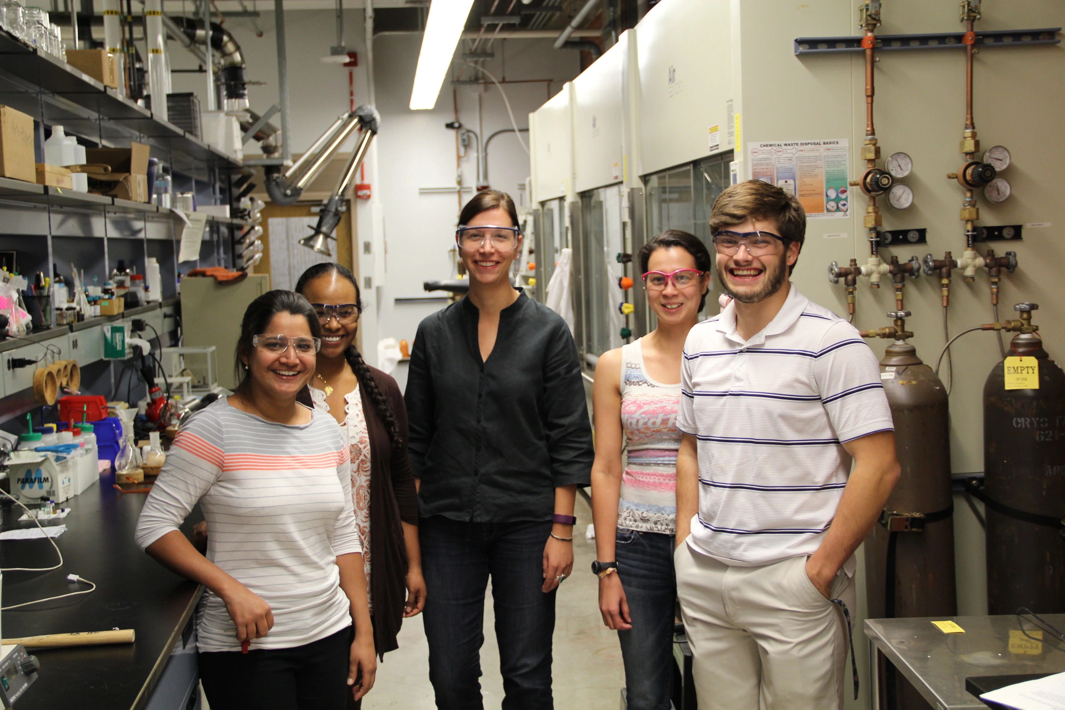 The group in the lab in Fall 2016. From the left: Ritika Gautam (PhD '17), Eman Akam (PhD '16), ET, Rachel Utterback (PhD '20), Steven Petritis