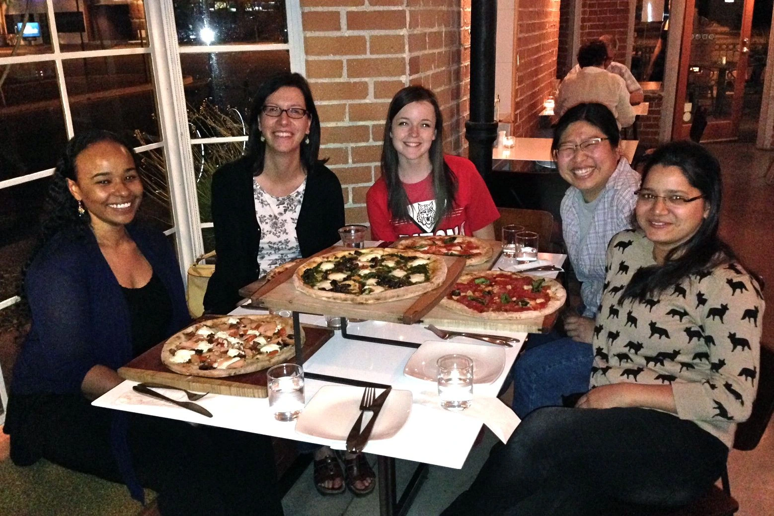 Out for pizza in fall 2014. From the left: Eman Akam (PhD '16), ET, Nicole O'Connor (BS '14), Michelle Chang (postdoc 2012-14), Ritika Gautam (PhD '17)
